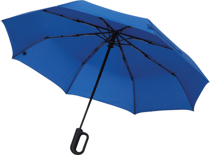 Vollautomatischer Windproof-Taschenschirm SCIROCCO in farblich abgestimmtem Futteral: 3-teiliger Metallstock, mit Metall-Fiberglasspeichen und Metalltips, schwarzer gummierter Karabiner-Kunststoffgriff, Polyester-Pongee-Bespannung aus recycelten Kunststoffen / RPET, Schließband mit Klettverschluss