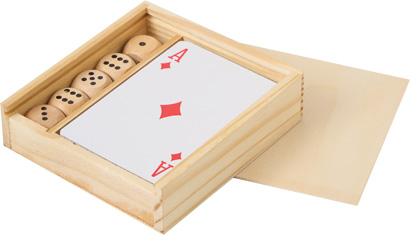 Spiele-Set EVERGAME: bestehend aus Kartenspiel mit 54 Spielkarten (inkl. 2 Joker) und 5 Würfeln, im Holz-Schiebedeckelkasten, in Box