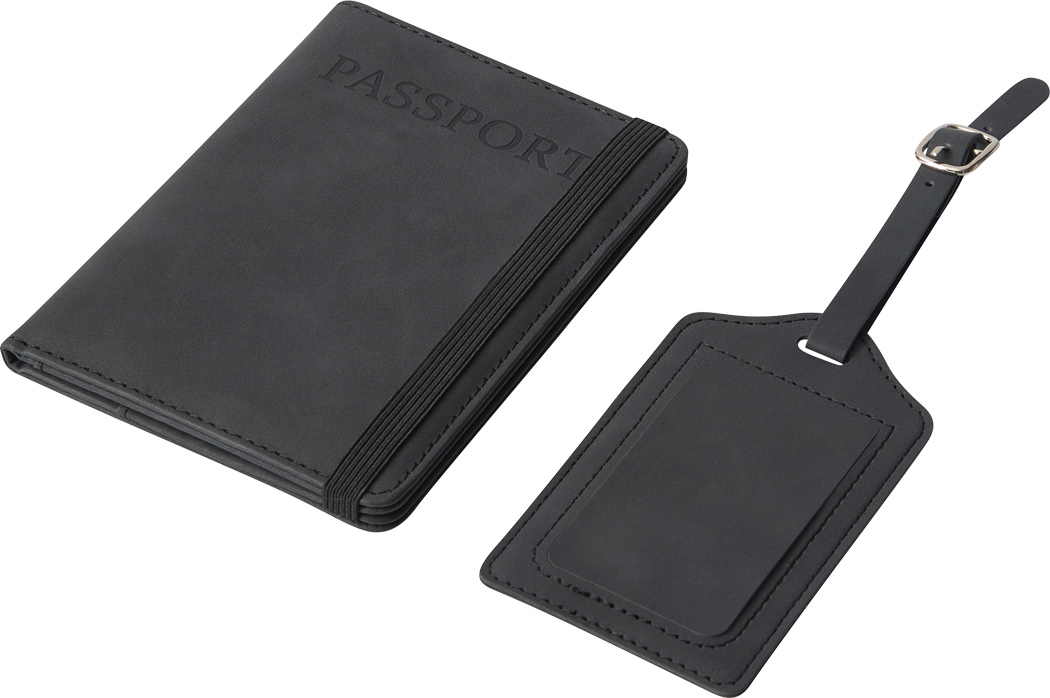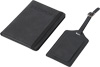Reiseset VISA, 2-teilig: bestehend aus handlicher Reisepassbörse mit 4 Einsteckfächern für Geldkarten, 1 Fach für Bordkarten, 1 Fach für den Reisepass, mit Gummiband zum Verschließen und Kofferanhänger mit verdecktem Adressfeld und Anhängeband mit Schnalle, in Box