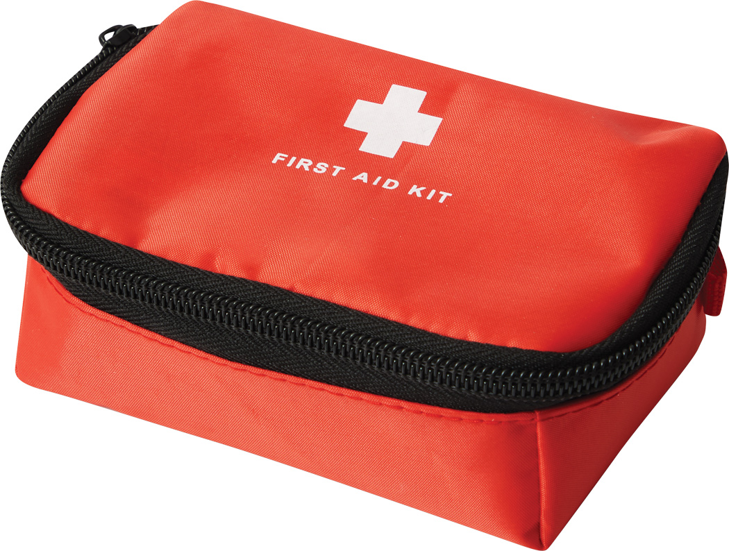 Notfall-Set BIGGUARD, 20-teilig: bestehend aus 1 kleinen Schere, 9 Heftpflastern, 1 Fixierbinde, 1 Rolle Klebeband, 1 Mullbinde, 2 Alkoholpads, 1 Kompresse, 1 Dreiecktuch, 2 Sicherheitsnadeln, verpackt in einer Nylontasche mit umlaufendem Reißverschluss zum Verschließen