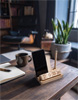 Bamboo memo holder PERPETUAL: with perpetual calendar consisting of 4 wooden cubes with engraved English date elements (weekdays, days of the month, and months), smartphone holder, with 50 memo sheets (70 g/m²), bamboo ballpoint pen with metal clip (black ink) and slots for 2 pens, in box