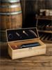 Set de vin PRECIOUS PLUS, dans une boîte-cadeau en bambou, 5 pièces, pour 1 bouteille : composé d'un anneau à gouttes en acier inoxydable, d'un bouchon en métal avec bouton en bois, d'un verseur en métal avec bouchon en bois et d'un sommelier en acier inoxydable avec manche en bois, dans une boîte individuelle