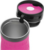 Bicchiere termico GOLDEN DREAM, a doppia parete: all`interno e all`esterno in acciaio inox, tappo in plastica con sicura chiusura a giro, pulsante push-button per aprire e chiudere e foro per bere integrato - al di fuori con gancio grazie al quale il tappo si lascia appoggiare sul bordo del bicchiere, fascia centrale in silicone dal colore abbinato per sicura impugnatura, capacità ca. 380 ml, in confezione regalo