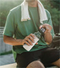 Glazen drinkfles TAKE JUTY: RVS schroefdop en siliconen afsluitring, incl. gekleurde jute beschermingshoes, inhoud ca. 450 ml, verpakt in witte doos.