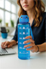 Sportowa butelka na wodę AQUA LEVEL. Przezroczysta, kolorowa butelka wykonana z wytrzymałego PETG. Ma dopasowaną kolorystycznie plastikowa zakrętkę z silikonowym pierścieniem uszczelniającym i odchylany ustnik do picia oraz uchwyt do przenoszenia. Posiada motywującą skalę czasu i objętości wody (pora dnia/ml) oraz pasek na rękę. O pojemności ok. 1000 ml.